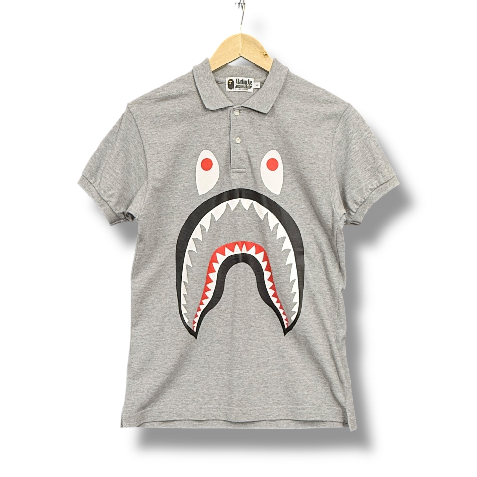 Product details: Gray cotton piqué, classic buttoned polo collar, front features large shark face print, iconic BAPE branding inside. Brand: A Bathing Ape.