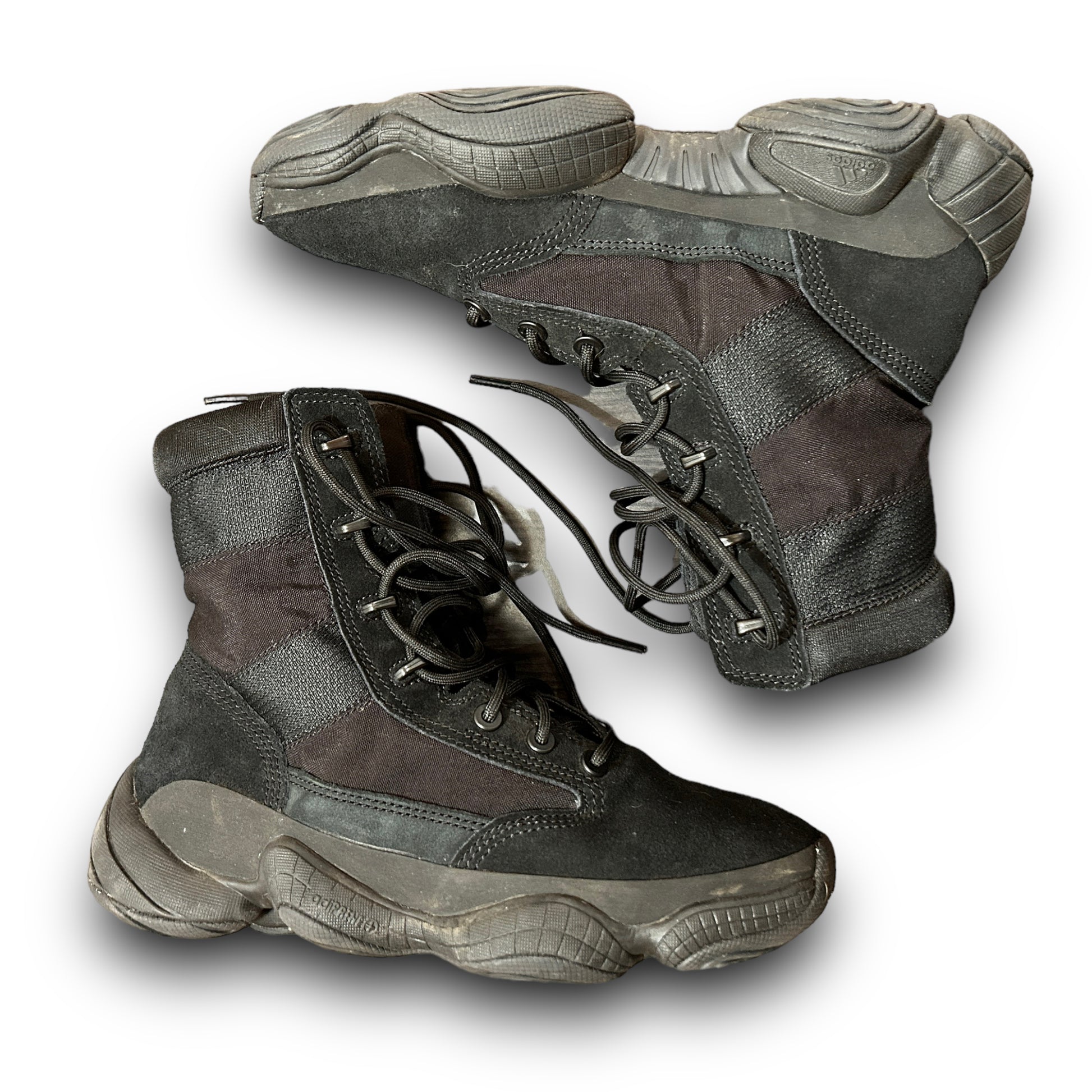 Step up your style and utility game with the Yeezy 500 High Tactical Boot in 'Utility Black.' These preloved boots, fit for a UK size 8, combine fashion and function for a unique and versatile look. Don't miss out on these limited edition kicks that will take your outfit to the next level! (the laces contain fire starters)